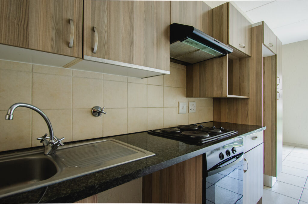 – Modern kitchen with granite tops, stove, and extractor fan